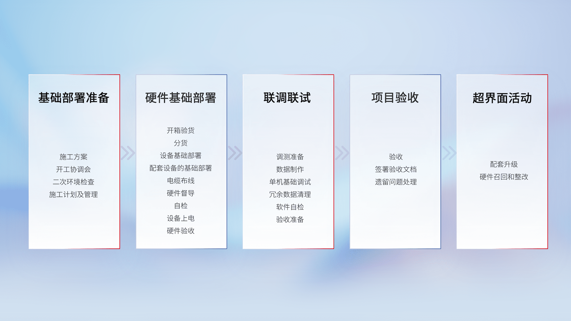 从基础部署准备、、、硬件基础部署、、、联调联试、、项目验收、、越界面活动的全过程可追溯,,保证施工质量和进度。。。